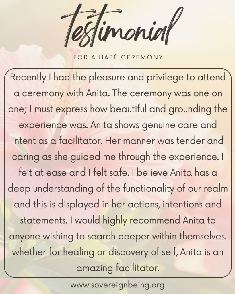 Following the treatment, Anita lead an exquisite Rapé (Hape) Ceremony. With lightness and grace she administered the medicinal herb and again, created a peaceful space for me to breathe and explore even deeper into my heart centre. I will certainly be working with Anita again; she is a true healer and a beautiful human.